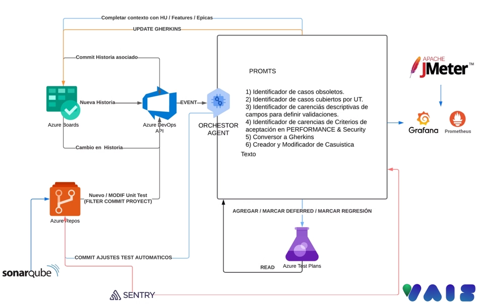 Esta práctica se potencia en el momento en que ya nuestros analistas escriben las HU (Historias de Usuario) usando agentes expertos los cuales inician un flujo de trabajo (workflow) automatizado. Este sistema de IA diseña las pruebas, sugiere un plan de pruebas (Test Plan), se responsabiliza de la observabilidad y reporta y deriva bugs en tiempo real.